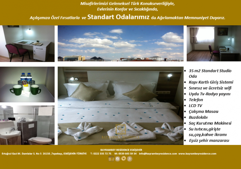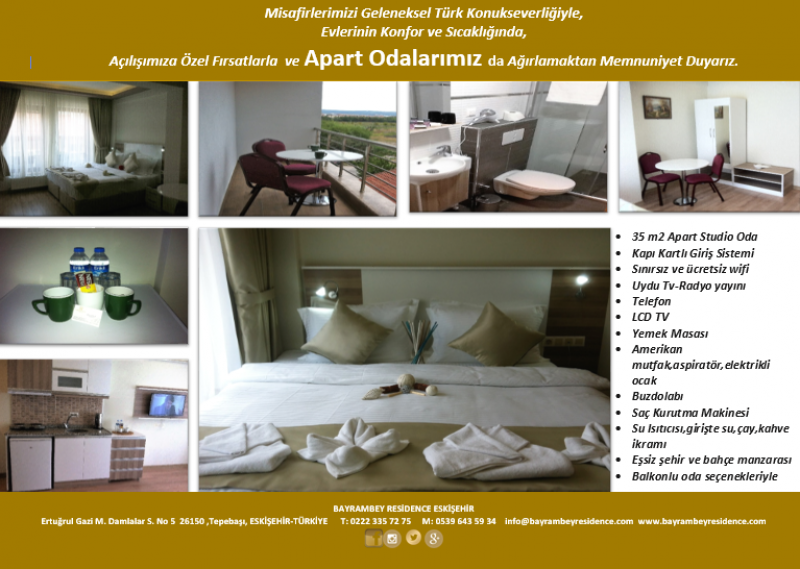 Bayrambey Otel Eskişehir'de ailelere,iş seyahatlarinizde,düğün organizasyonlarınıza,gruplara,hasta refakatçılarına veya tedavisi devam eden hastalara günlük,haftalık, aylık veya yıllık konaklama hizmeti sunulmaktadır. Ayrıca konferanslarınız, seminerleriniz, workshoplarınız, lansmanlarınız, iş toplantılarınız ya da özel organizasyonlarınıza hizmet verilebilmektedir. Misafirlerimize emniyetli ve güvenli bir yaşam ortamı sunuyoruz.Güvenliğiniz için,Girişte görüntülü diafon ve şifreli bina girişi,odalar hariç tüm bina harekete,ışığa,sese duyarlı kamera takip ve kontrol sistemi ile takip edilmektedir.Tüm odalara kişiye özel kartlı otel kapı kilit sistemi ile girilebilmektedir.Ayrıca tüm oda kapıları arkasında güvenlik kilidi mevcuttur.Odalar arası ve bina girişi ile görüntülü diafon sistemi mevcuttur. Konaklayan misafirlerimiz odalarına yiyecek&içecek sokabilir yada paket servis siparişi verebilirler. Tüm alanlarda ücretsiz internet hizmeti sunulmaktadır.