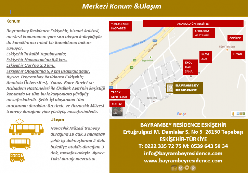Bayrambey Otel Eskişehir; hizmet kalitesi ve merkezi konumunun yanı sıra ulaşım kolaylığıyla da konuklarına rahat bir konaklama imkanı sunuyor. Bayrambey Otel Eskişehir'in iş,eğlence ve oteller Bölgesi'nin kalbi Tepebaşında;Eskişehir Havaalanı'na 6,4 km., Eskişehir Garı'na 2,3 km., Eskişehir Otogarı'na 5,9 km., Espark AVM'ye 2,1 km., Barlar Sokağına 2,5 km., uzaklığındadır. Ayrıca, Bayrambey Otel; Bursa-Ankara çevre yolu kenarında,Anadolu Üniversitesi,Yunus Emre Devlet ve Acıbadem Hastaneleri ile Özdilek Avm'nin keşistiği konumda ve tüm bu lokasyonlara yürüyüş mesafesindedir. Şehir İçi ulaşımının(tranvay,otobüs,minibüs) tüm araçlarının durakları üzerinde ve Havacılık Müzesi tranvay durağına yine yürüyüş mesafesindedir.